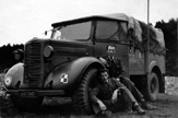 Kpr. pchor. Józef Krzywonos (na dole) i nierozpoznany lotnik przy ciężarówce-radiostacji 309 Dywizjonu, oznaczonej na błotnikach kokardą RAF oraz polską szachownicą.