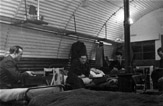 Kwatera mieszkalna w blaszanym baraku w bazie Coltishall. Pierwszy z lewej siedzi kpt. Henryk Pietrzak, ostatni dowódca dywizjonu (od lipca 1945 r. do rozformowania).