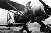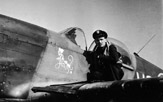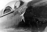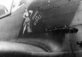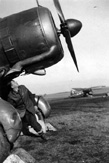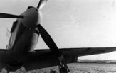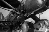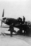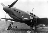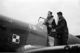 Żołnierz personelu naziemnego pomagający opuścić kabinę Mustanga I ppor. pil. Wincentemu Miniszewskiemu. Przed wiatrochronem widoczne jest okrągłe godło osobiste, a pod namalowaną na okapotowaniu silnika szachownicą widoczne są oznaczenia lotów bojowych w postaci liter „V”. Lata 1942-1943.