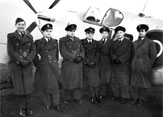 Od lewej: por. Kazimierz Karaszewski, por. Roman Jarema, nierozpoznany, ppłk Witold Jacek Piotrowski, nierozpoznany, nierozpoznany, por. Sergiusz Czerni przy Mustangu III WC-U pozbawionym kamuflażu, w naturalnym kolorze blachy duralowej. Nad głową oficera trzeciego od lewej widać namalowane na samolocie godło dywizjonowe.