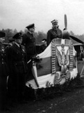 Naczelny Wódz gen. Kazimierz Sosnkowski na trybunie honorowej ozdobionej orłem lotniczym, po dekoracji lotników, Snailwell, 11 października 1943 r.