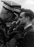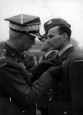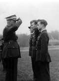 Naczelny Wódz gen. Kazimierz Sosnkowski salutuje po odznaczeniu oficerom 309 Dywizjonu, od prawej: ppor. Romanowi Jaremie, kpt. Januszowi Lewkowiczowi i kpt. Władysławowi Gnysiowi. Snailwell, 11 października 1943 r.
