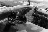 Mechanicy 309 Dywizjonu przy pracy nad potężnym silnikiem Mustanga III Rolls-Royce Merlin. Z prawej jeden z pilotów por. Zygmunt Jaeschke, interesujący się mechaniką i asystujący żołnierzom personelu naziemnego.