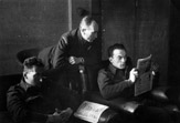 Trzej piloci 309 Dywizjonu w czasie odpoczynku w kasynie oficerskim, od lewej: por. Jan Mozołowski, por. Mieczysław Befinger i ppor. Zygmunt Jaeschke. Drem, 8 listopada 1944 r.