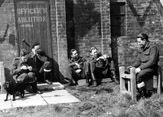 Piloci 309 Dywizjonu siedzący przy baraku łaźni oficerskich w bazie RAF Andrews Field na początku kwietnia 1945 r.
